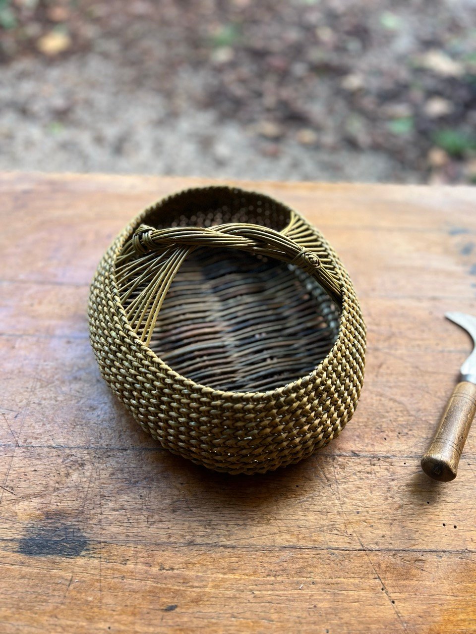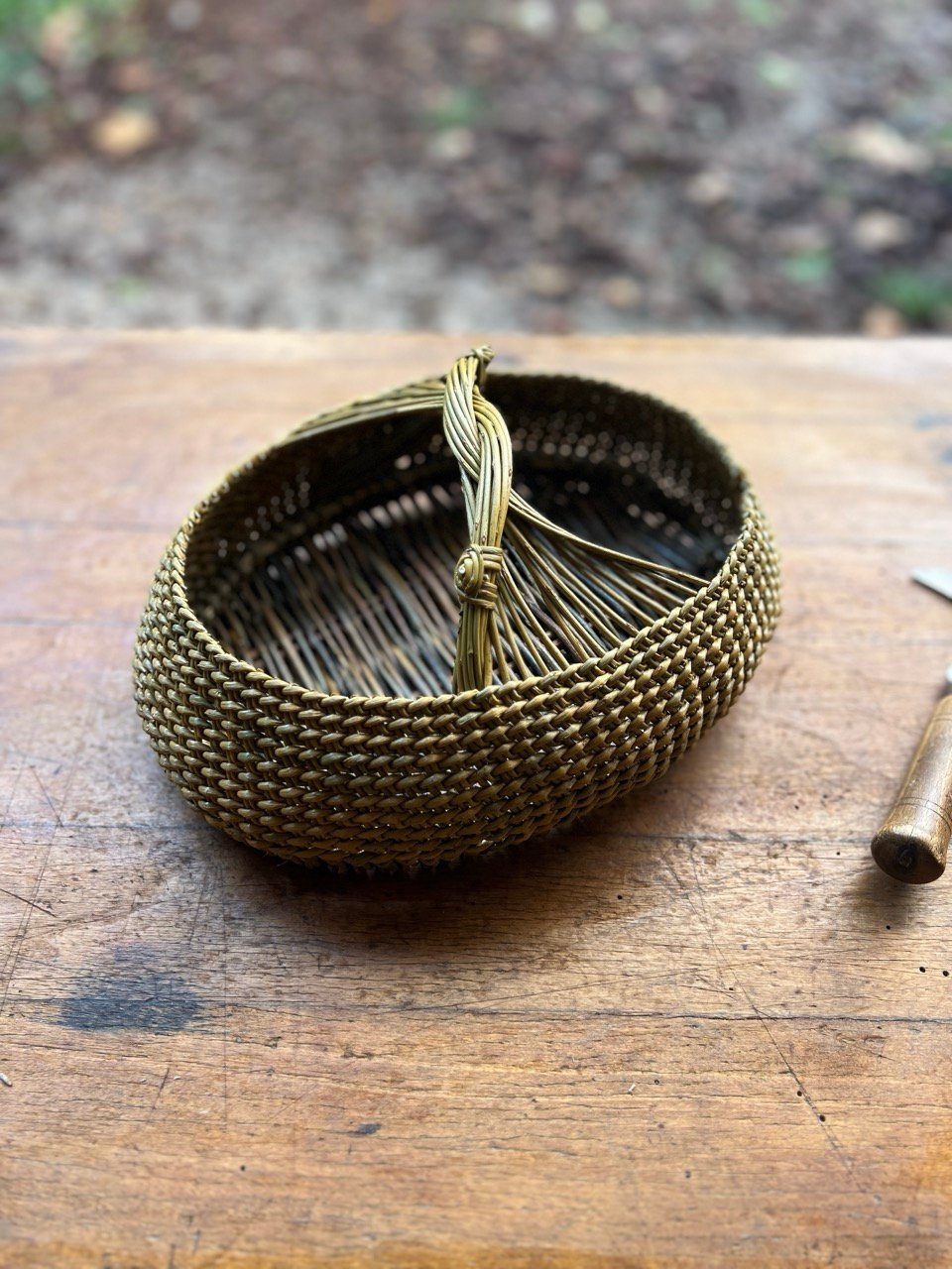 An oval basket woven using the Neolithic technique with scallomed stakes.